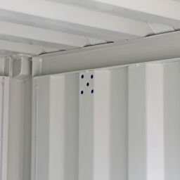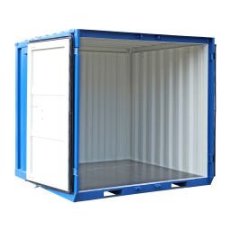 Die pulverbeschichtete Oberfläche in RAL 5010 Blau schützt zuverlässig vor Witterungseinflüssen und sorgt für eine lange Lebensdauer. Der Holzboden ist belastbar und eignet sich ideal für die Lagerung verschiedenster Materialien. Die Türen zum Öffnen ermöglichen einen komfortablen Zugang zum Innenraum.
