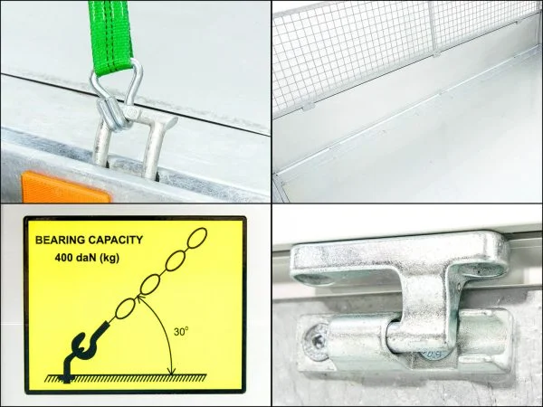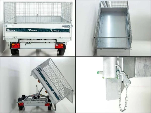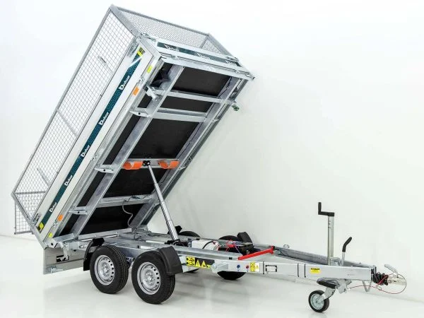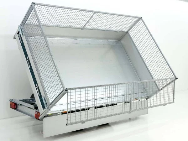 Die elektrische Hydraulikpumpe (Batteriebetrieb) ermöglicht ein komfortables und sicheres Kippen nach drei Seiten. Der 600 mm hohe Gitteraufsatz erweitert das Ladevolumen deutlich und ist bei Bedarf abnehmbar. Die klapp- und abnehmbaren Aluminium-Bordwände (350 mm) sorgen für flexible Belademöglichkeiten.