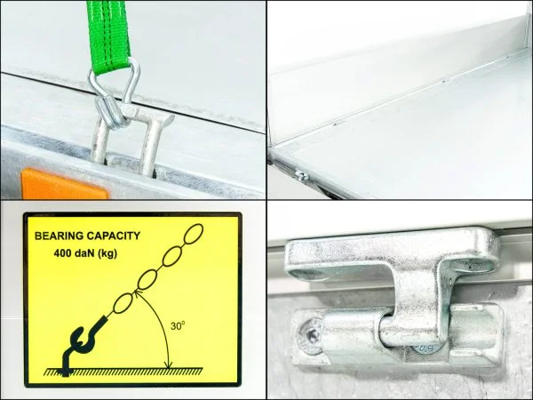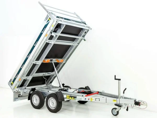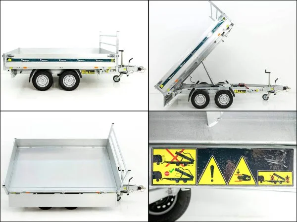 Die elektrische Hydraulikpumpe (Batteriebetrieb) ermöglicht ein komfortables und sicheres Kippen nach drei Seiten. Über die integrierten Ladekontakte im Rahmenprofil (12 V) lassen sich Ladegeräte bequem anschließen. Die klapp- und abnehmbaren Aluminium-Bordwände (350 mm) sorgen für maximale Flexibilität beim Be- und Entladen.
