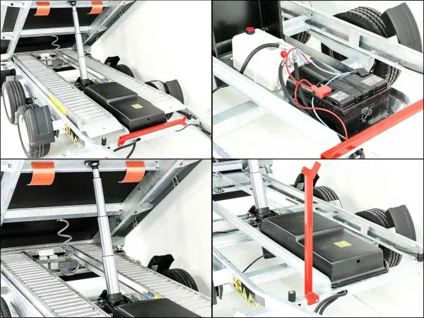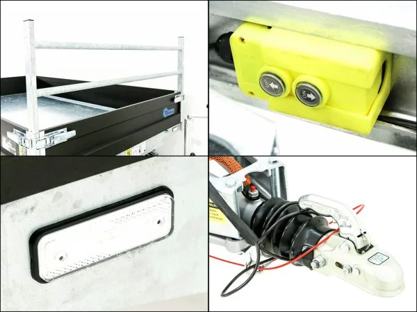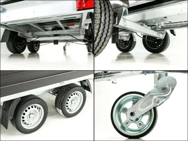 Das verzinkte H-Gestell, der integrierte Rampenschacht sowie die leichten Aluminium-Auffahrrampen ermöglichen vielseitige Einsatzmöglichkeiten – auch für Maschinen und Geräte. Das komplett feuerverzinkte Fahrwerk mit Gummifederachse sorgt für Stabilität, Langlebigkeit und hervorragende Fahreigenschaften.