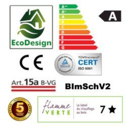 Cumple con la normativa Ecodesign 2022, garantizando bajas emisiones contaminantes y una combustión optimizada. Con un rendimiento del 80 % y una emisión de CO del 0,10 %, esta estufa ofrece una excelente eficiencia energética y un confort térmico constante.