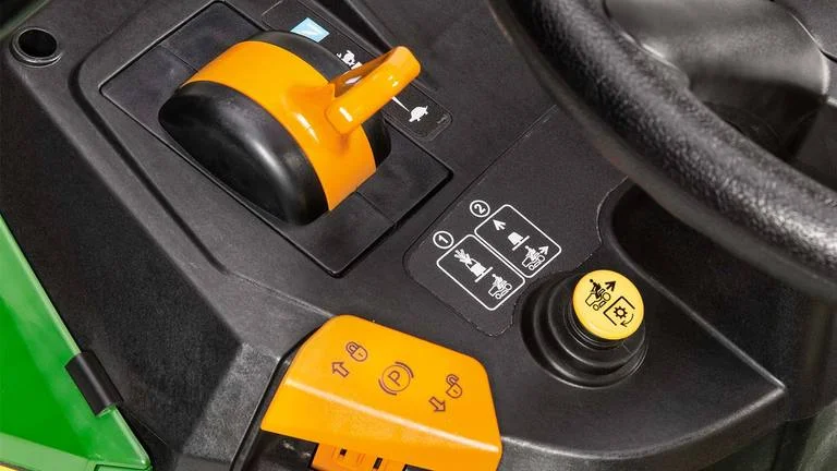 Die zwei nebeneinander angeordneten Pedale erlauben eine intuitive Steuerung von Vorwärts- und Rückwärtsfahrt. Mit einer Schnittbreite von 92 cm (36″) ist die X117R perfekt für kleinere Rasenflächen, Gärten und enge Durchfahrten geeignet.