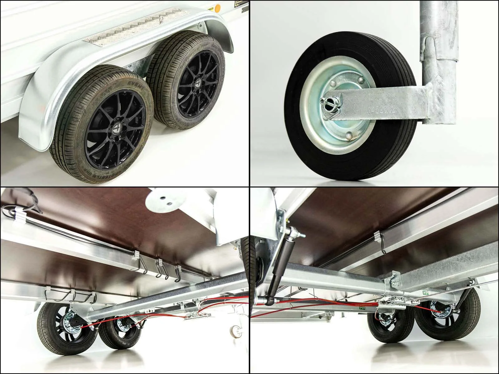 Dank Radstoßdämpfern mit Tempo-100-Zulassung, großer 205/55 R16 Bereifung auf schwarzen Alufelgen und feuerverzinktem AL-KO Fahrwerk bietet der Anhänger ein ruhiges, sicheres Fahrverhalten – auch bei hoher Beladung.