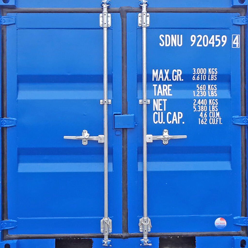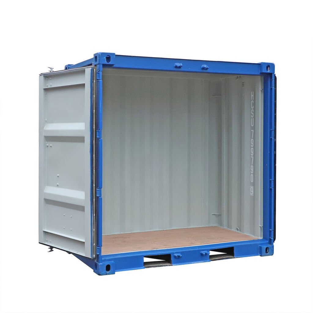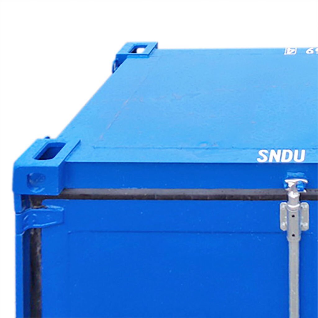 Die blaue Lackierung in RAL 5013 verleiht dem Container ein professionelles Erscheinungsbild und schützt ihn zuverlässig vor Witterungseinflüssen – ideal für den Innen- und Außeneinsatz.