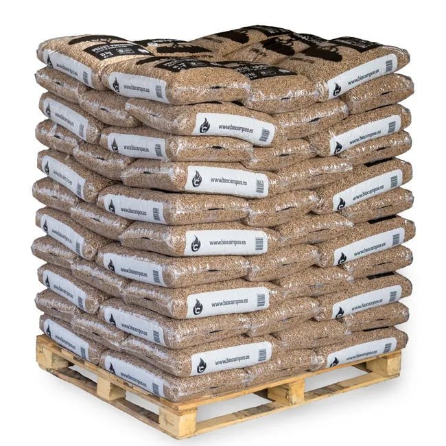 Los Pellets Maderas Campos ofrecen una solución de calefacción eficiente y ecológica. Este palé incluye 88 sacos de 15 kg cada uno, con un peso total de 1.320 kg, elaborados con 100% madera de pino natural.