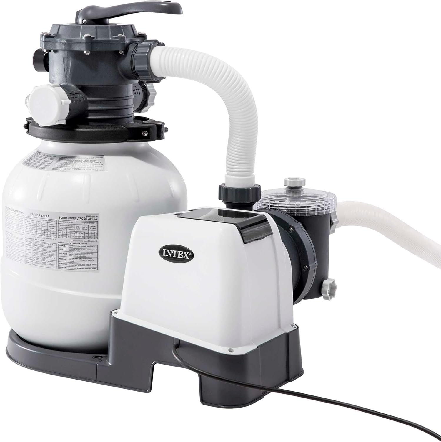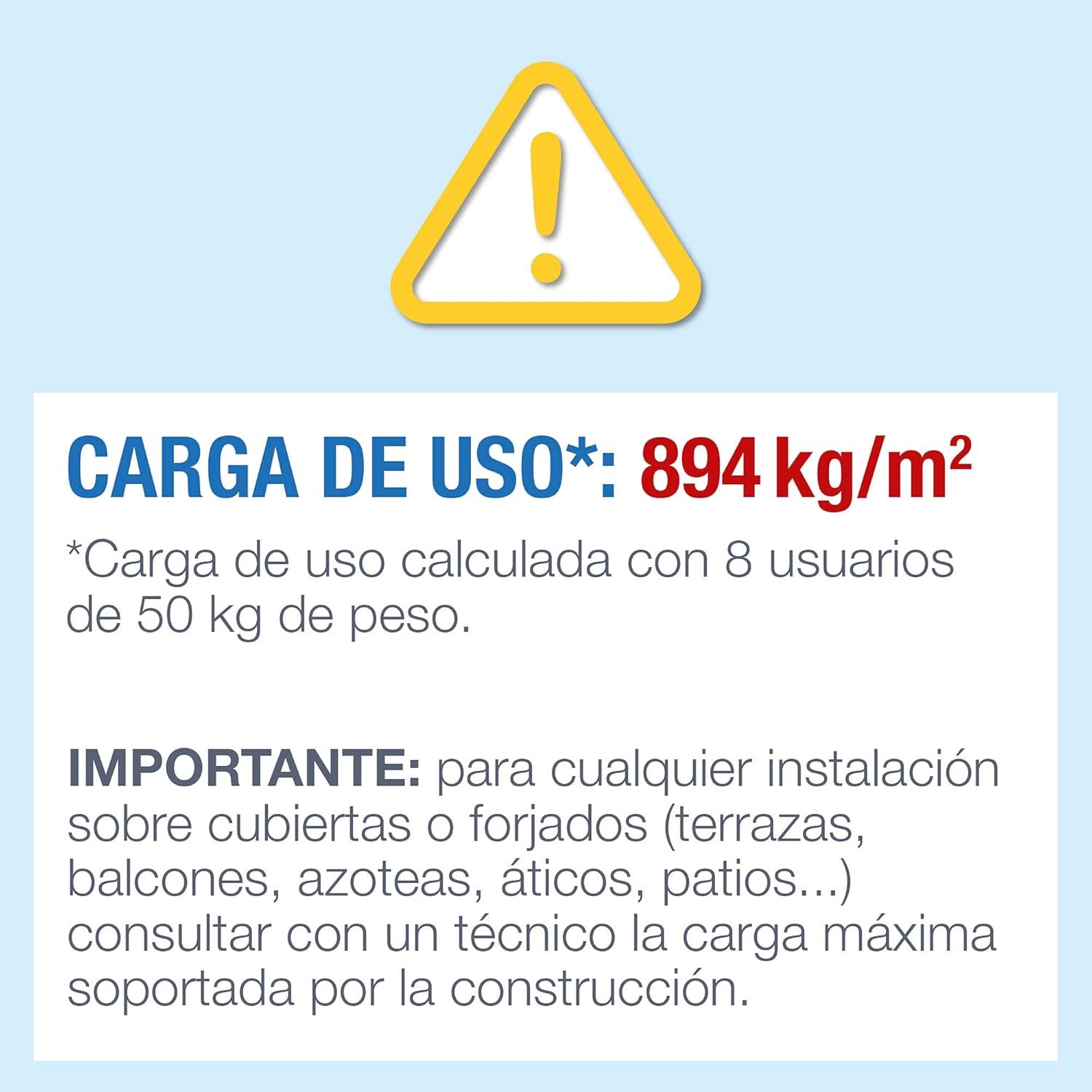 Incluye depuradora de arena con capacidad de filtración de 7900 l/h y conexión de 38 mm (arena no incluida), escalera de seguridad, tapiz y cobertor
